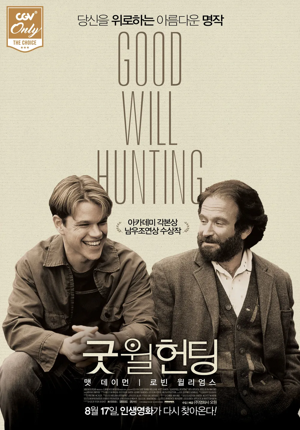 <굿 윌 헌팅(Good Will Hunting)>은 1997년 개봉한 미국 드라마 영화로, 가슴 깊숙이 울림을 주는 감동적인 휴먼 스토리입니다. 구스 반 산트(Gus Van Sant) 감독이 메가폰을 잡았으며, 각본은 당시 신인 배우였던 맷 데이먼(Matt Damon)과 벤 애플렉(Ben Affleck)이 직접 집필했습니다. 두 사람은 이 작품으로 아카데미 시상식에서 각본상을 수상하며 헐리우드의 떠오르는 스타로 자리매김했습니다.